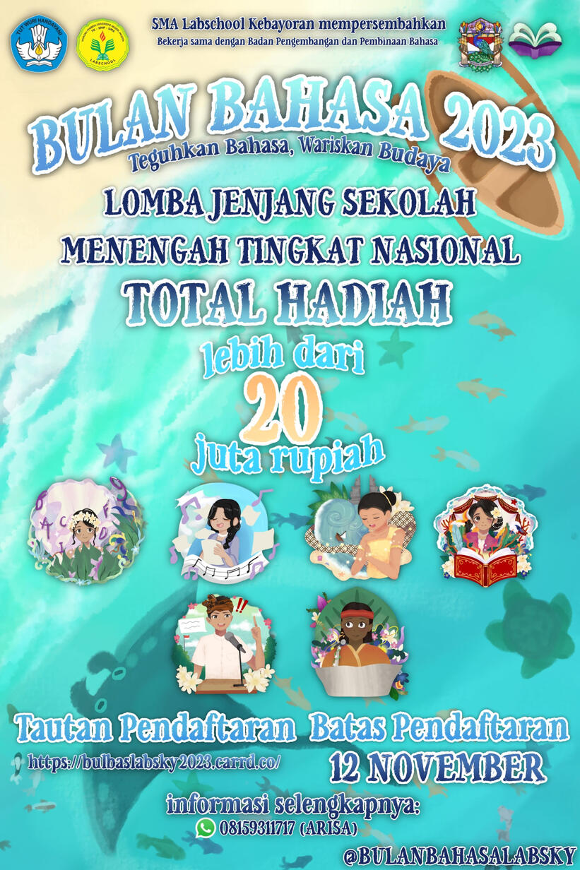 Salam hangat!🌅 Bulan Bahasa SMA Labschool Kebayoran kini kembali dan dibawakan oleh OSIS Gardika Mahawira yang resmi bekerja sama dengan Badan Pengembangan dan Pembinaan Bahasa Kemendikbudristek ‼️Bulan bahasa adalah ajang perlombaan tahunan yang memiliki keunikan tersendiri setiap tahunnya. Tahun 2023 ini kami mengangkat persatuan melalui bahasa dan budaya yang terselimuti dalam tema "Teguhkan Bahasa, Wariskan Budaya".✍️ Pendaftaran lomba diperpanjang hingga 16 November 2023.📱 Contact Person: